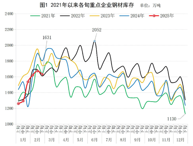 2025年2月下旬,重點(diǎn)統(tǒng)計(jì)鋼鐵企業(yè)(以下簡稱“重點(diǎn)企業(yè)”)鋼材庫存量1631萬噸,環(huán)比上一旬減少42萬噸,下降2.5%;比年初增加394萬噸,增長31.9%;比上月同旬增加96萬噸,增長6.3%;比去年同旬減少171萬噸,下降9.5%,比前年同旬減少111萬噸,下降6.4%(見圖1)。
