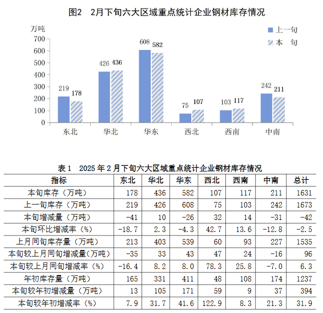 2月下旬六大地區(qū)中,華北、西北、西南地區(qū)重點(diǎn)企業(yè)鋼材庫存較上一旬有不同程度增長,其它地區(qū)均有不同程度下降(見圖2、表1),具體情況為: